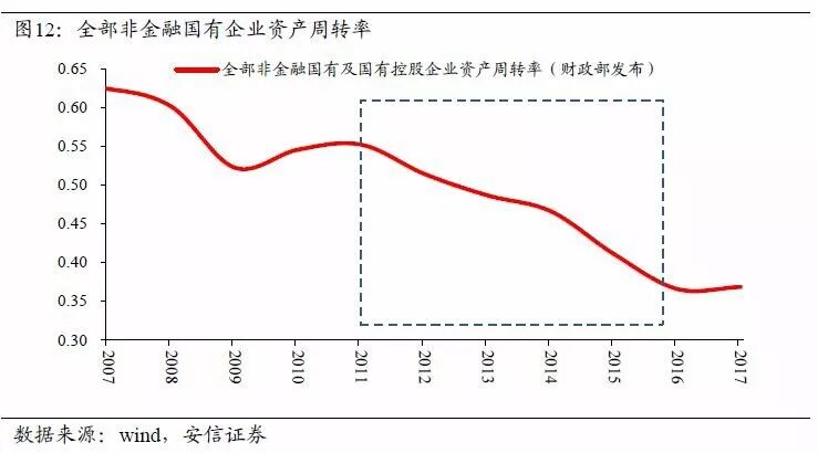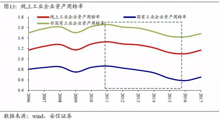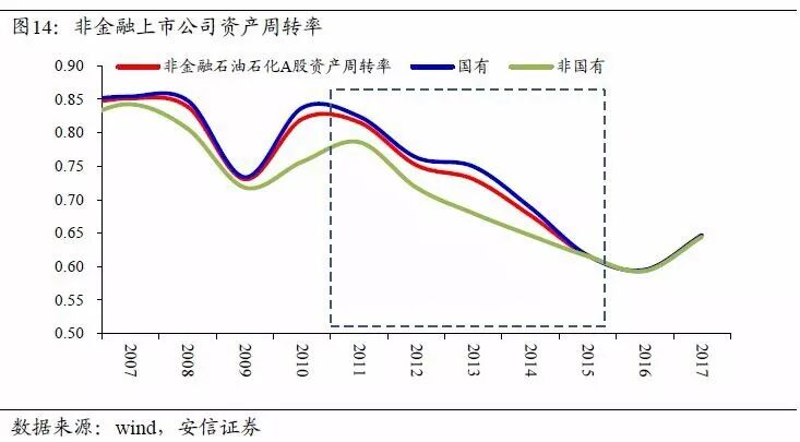 研究不同口径的企业资产周转率数据显示,2011年以来,所有类别企业的周转率都经历了持续和大幅度的下降,并在2016年达到前所未见的水平,这成为推动宏观杠杆率上升的重要原因。