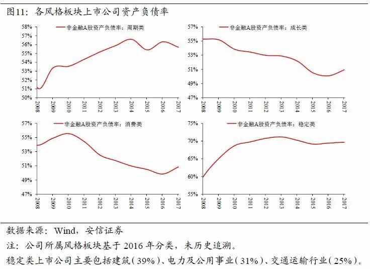 更细致的行业分类显示,杠杆率的上升主要集中在周期类的板块,以及电力、交运和建筑等具有周期色彩的行业;其他板块的企业总体上也没有经历杠杆率的提高。