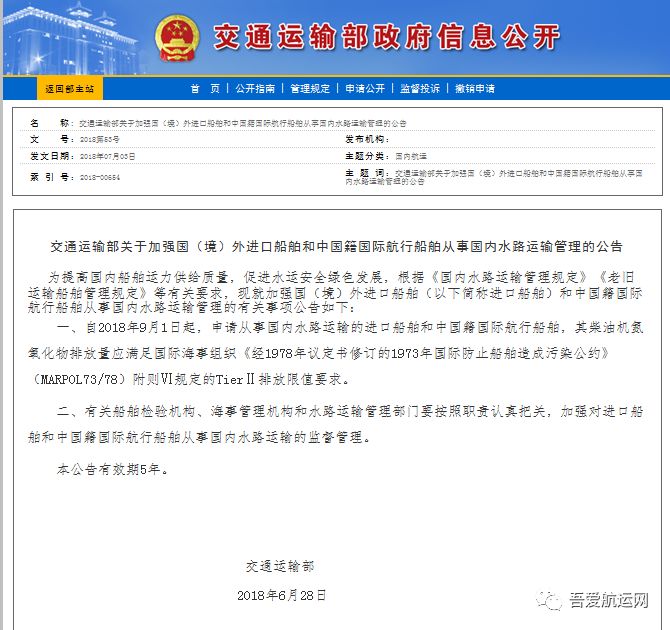 根据公告要求,明确自2018年9月1日起,申请从事国内水路运输的进口船舶和中国籍国际航行船舶,其柴油机氮氧化物排放量应满足国际海事组织《经1978年议定书修订的1973年国际防止船舶造成污染公约》(MARPOL73/78)附则Ⅵ规定的TierⅡ排放限值要求。