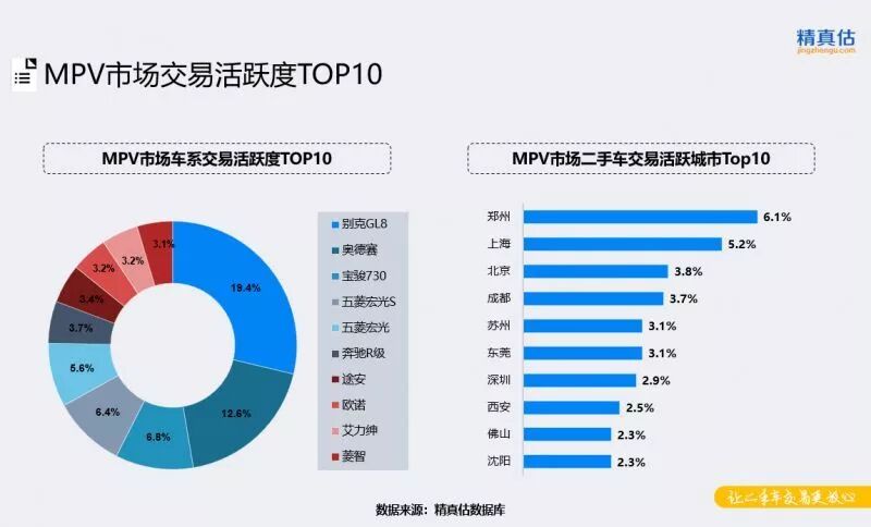 MPV市场中,别克GL8、本田奥德赛的二手车交易活跃度最高,占比均超过10%,在新车市场,这两款产品也是MPV用户的首选。第二梯队宝骏730和五菱宏光代表自主品牌阵营,份额合计达到18%。奔驰R级作为高端商务用车的代表,在二手车市场仍然得到消费者较高的认可。从城市分布上看,郑州、上海、北京超越太原跃居前三甲,其次苏州、东莞、西安等二线城市由于其日益增长的商务出行需求,MPV市场交易活跃度也有所上升。