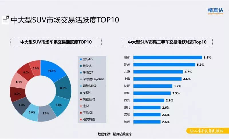 中大型SUV市场集中度仍然很高,宝马X5、丰田普拉多、奥迪Q7在二手车市场交易量也长期霸占前三甲。中大型SUV溢价较高,豪华品牌车型居多,除此之外普拉多、途锐以其较高的产品力,拼得一席之地。哈弗H9交易活跃度下降,跌出前十。从城市分布来看,该细分市场交易集中度相对较低,成都仍然占据首位,市场份额达到6.5%,其次郑州、上海、沈阳、深圳等城市交易活跃度明显提升。