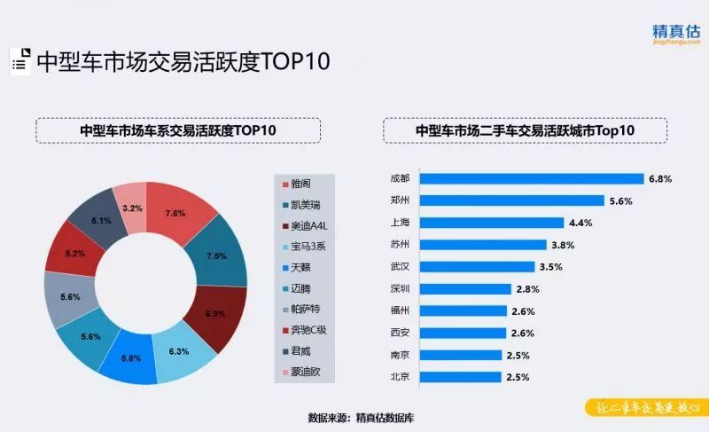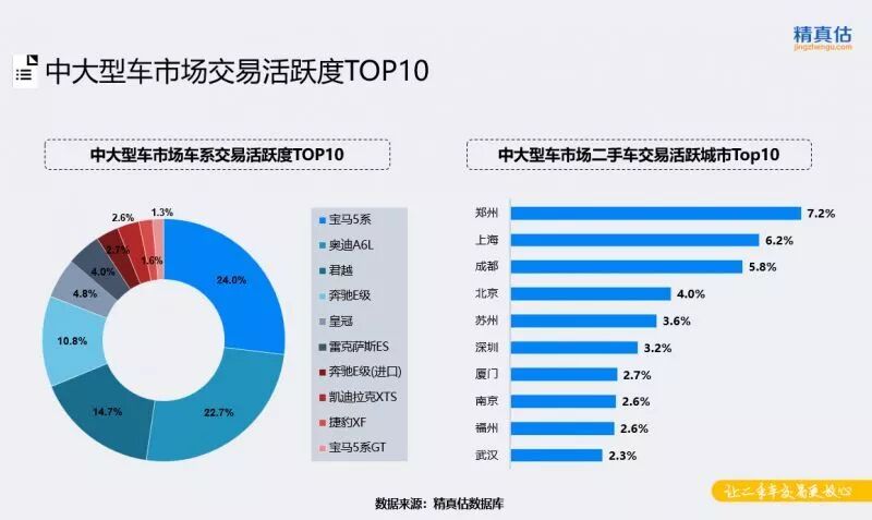 中大型车市场中,车型相对较少,交易集中度较高,传统豪华品牌主力车型BBA的份额达到57%。除此之外,别克君越、丰田皇冠是入围此细分市场的两个合资品牌车型,分别在南方和北方市场获得了认可。从地区分布来看看,郑州交易活跃度大幅上升,份额超过7%。上海、北京、苏州、深圳等城市交易活跃度较高。