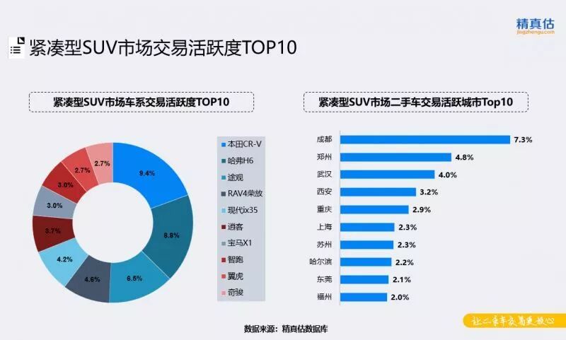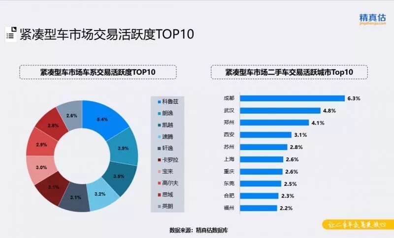 紧凑型车市场是各个厂商兵家必争之地,车型众多且交易活跃度最为分散。科鲁兹交易活跃度上升,大众品牌表现突出,产品线众多,前十名中入围4个车型。地区分布上来看,交易份额集中度有所上升,份额占比超过4%的城市有三个,成都仍然占据第一名。郑州、西安、苏州等城市交易活跃度均有所上升。