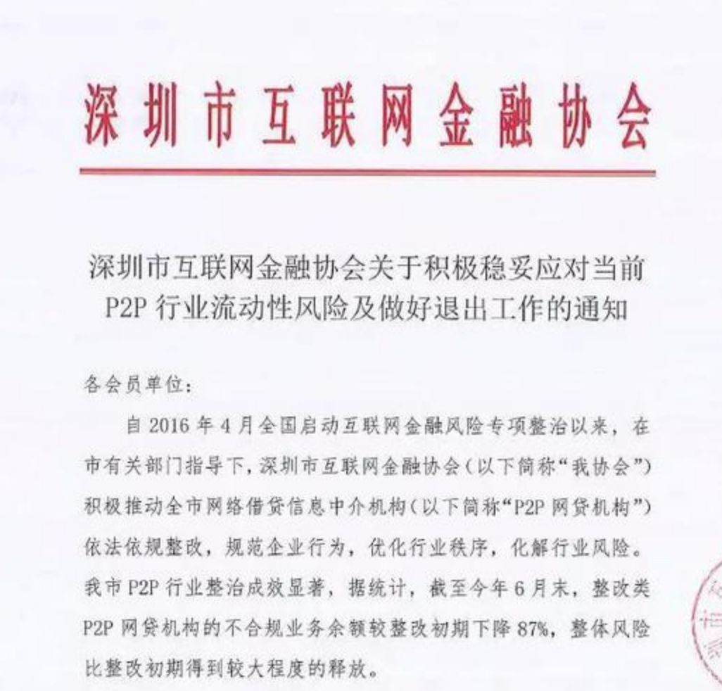 7月13日,深圳市互联网金融协会发布《关于积极稳妥应对当前P2P行业流动性风险及做好退出工作的通知》(以下简称《通知》)。