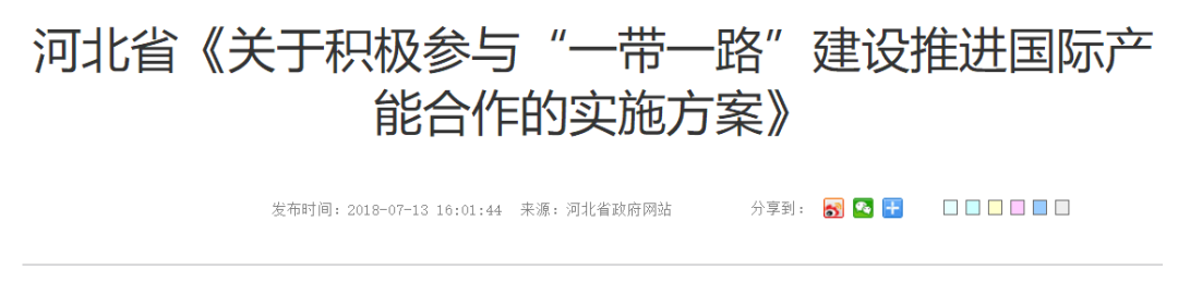 近日,河北省印发《关于积极参与“一带一路”建设推进国际产能合作的实施方案》(以下简称“《方案》”),《方案》提出,到2020年,全省境外投资
