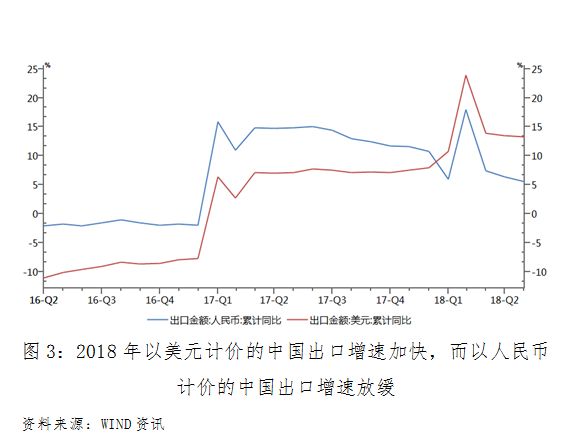 不仅仅是对美出口,2018年以来中国整体出口形势均有受人民币升值影响。2018年1-5月,以美元计价的中国出口增速为13.3%,较去年同期加快约6个百分点;以人民币计价的中国出口增速仅有5.5%,较去年同期下滑约9个百分点。因此,虽然贸易战阴影笼罩,在欧美经济复苏的大背景下中国出口仍保持了较好走势,但受2017年人民币升值影响,中国出口增速出现了较大下滑(图3)。