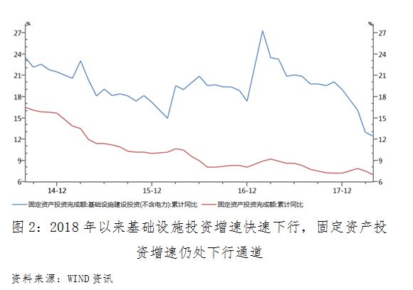 2017年下半年以来基础设施投资增速快速下行,受此影响固定资产投资增速仍处于下行通道。基础设施投资是固定资产投资中的重要组成,其规模约占总固定资产投资规模的20%。与固定资产投资增速持续下行不同,2014年以来基础设施投资增速始终保持在20%左右的较高水平。但自2017年下半年开始,基础设施投资增速出现快速下行,2018年1-5月,基础设施投资增速仅有9.4%,较去年同期下降约11个百分点。受此影响,虽然2017年经济明显复苏、企业家信心显著修复,但固定资产投资增速仍处于下行通道,2018年1-5月,固定资产投资增速为6.1%,较去年同期下行2.5个百分点(图2)。部分省份基础设施投资增速下滑尤其突出,如湖北一季度基础设施投资增速仅有4.6%,湖南为-1.7%,江苏为-15.5%,分别较去年同期下滑24.7、24.8、38.7个百分点。