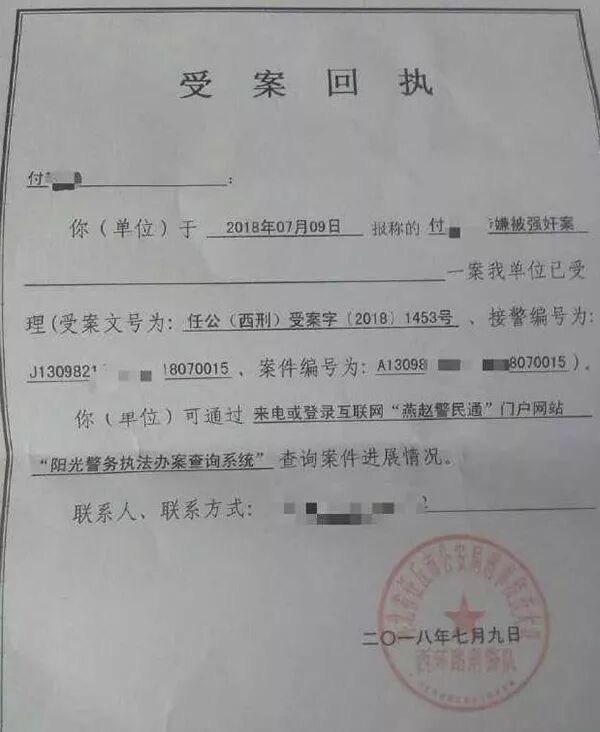 7月10日,付女士告诉大白新闻记者,自己9月拿到了任丘市西环路派出所的受案回执单。另外,7月13日,大白新闻联系到了被举报人崔某某,其称:我现在要起诉她,她这完全是陷害,以前也因为这事讹过别人的钱。之前她们家缺钱,我们关系还不错,就借了她2万块钱,有转账记录,找她要,她不给,到现在没还。后来,又找我借4000,我没借,就发生了这个事。