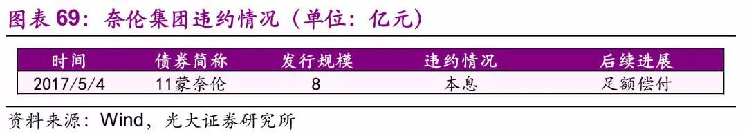 奈伦集团 25.1、违约及最新债务情况 发行人奈伦集团为民营企业,截至2018年7月13日,奈伦集团共涉入1起一般企业债违约事件,“11蒙奈伦”未能按期兑付,发生实质性违约。2018年5月4日,公司发布11蒙奈伦付息兑付暨摘牌公告,债券足额兑付,兑付日距离债券发生实质性违约2年时间。公司无存续债券。 25.2、违约事件历程 11蒙奈伦违约前发生的重大事件有: 1) 评级下调:2015/11/20鹏元资信下调主体及债券评级至BBB; 2) 业绩亏损预告:2016/2/25公司发布业绩预告:2015年业绩将亏损; 3) 停牌风险:2016年4月公司三次风险提示,债券可能暂停上市。 后续偿债主要方法:债务重组,公司力争通过债务重组实现债务清偿;贷款,向包商银行寻求贷款支持。 经过多方积极推动,奈伦集团公司于2017/2/3、2017/5/9日起分别支付了2015/5/5至2016/5/4、2016/5/5-2017/5/4的两期利息。2018年5月4日,公司发布《2011年内蒙古奈伦集团股份有限公司公司债券2018年兑付暨摘牌公告》,公告称将于2018年5月5日起开始支付11蒙奈伦的违约本息,至此违约债券足额偿付。