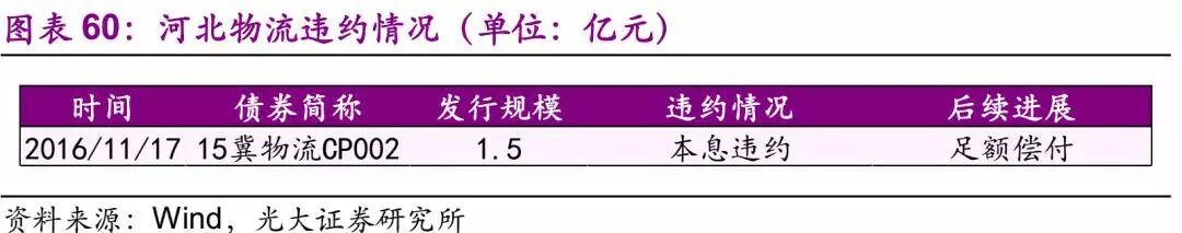 河北物流 21.1、违约及最新债务情况 发行人河北物流为地方国有企业,截至2018年7月13日,河北物流涉入1起违约事件。公司无存续债券。 21.2、违约事件历程 15冀物流CP002违约仅逾期一天即偿付本息,没有构成重大违约。 债券违约发生前公司重大事件有:董监高大幅变动;即期债务偿付压力大。2016年3月末,公司负债总额为116.20亿元,资产负债率为79.50%,短期刚性债务余额为88.66亿元,占负债总额的76.30%。 后续偿债主要方法:通过经营环节资金调配。