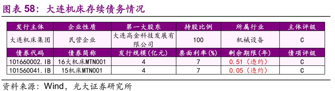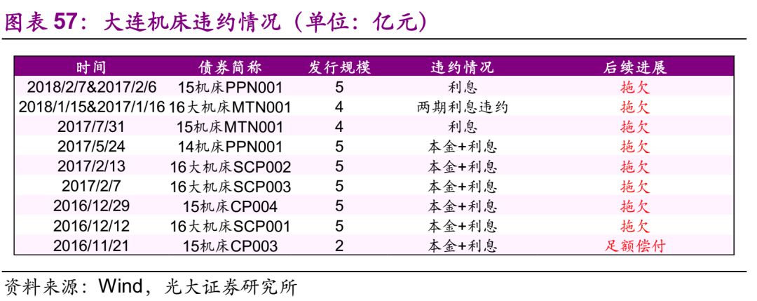 大连机床 20.1、违约情况 发行人大连机床是民营企业,公司经营范围包括机床制造与销售;机床零部件、汽车零部件、机床安装维修等,产品销售覆盖全国,在全国设有27各销售办事处。在国外设有12个销售办事处产品出口100多个国家和地区。公司实际控制人为大连高金科技发展有限公司。 截至2018年7月13日,大连机床共涉入9起违约事件,违约债券本金为40亿元,目前仅15机床CP003足额支付了本息。存续债共2只,规模8亿元。 20.2、违约事件历程 受国内宏观经济环境下行、公司产品结构调整、融资受阻等因素影响,公司资金链极度紧张,导致多只债券违约。 后续处置方式:合并重整。2018年7月5日,大连中院在全国企业破产重整案件信息网发布了27家公司合并重整的公告,债权人应于2018年8月4日前向管理人申报债权。
