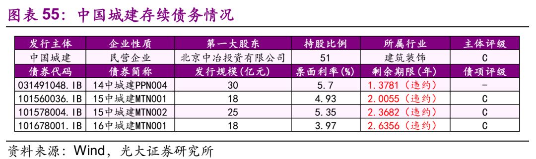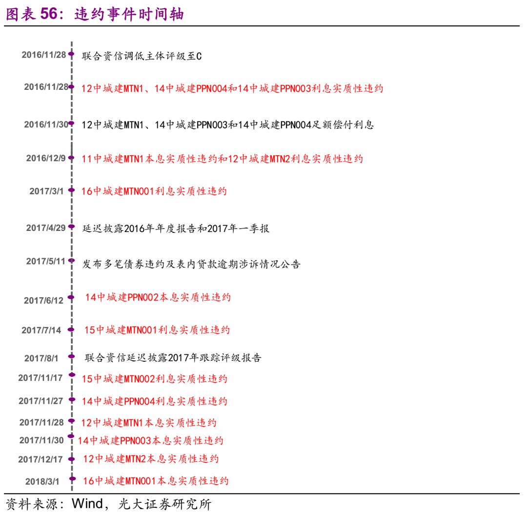中国城建 19.1、违约情况 发行人中国城建是民营企业,截至2018年7月13日,中国城建共有9只债券发生实质性违约,其中4只利息违约,5只本息违约,在违约的债券中,“12中城建MTN1”、“14中城建PPN003”、“14中城建PPN004”已延期2天足额支付了2016年应付利息,而本金到期仍在拖欠,“14中城建PPN002”支付了部分利息,其余债项本金和利息均在拖欠。 19.2、存续债务情况 公司是国内大型国家级城市开发建设企业。主营业务包括房地产开发与经营;城市基础设施、道路、管线、园林、桥梁、港口、水利工程和建筑工程的勘察、设计、施工、安装、承包、监理等。公司实际控制人为北京中冶投资有限公司。存续债共4只,规模91亿元。 19.3、违约事件历程 债券违约前的重大事项有: 1) 评级下调、控股股权纠纷、实际控制人变更等。受上述因素影响,公司融资受限,资金链十分紧张,造成实质性违约; 2) 中城建持有中城建国际100%的股权,中城建国际债券违约事件对中城建偿债能力造成一定负面影响。