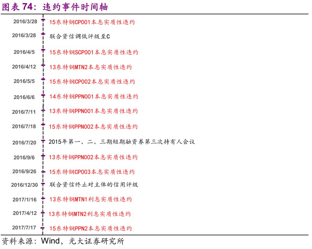 东北特钢集团 27.1、违约及最新债务情况 发行人东北特钢集团是地方国有企业,截至2018年7月13日,东北特钢集团共涉入10起违约事件,无存续债券。 27.2、违约事件历程 违约前重大事项有以下三点: 1) 评级下调:联合资信调低评级至C 2) 公司董事长意外身亡:东北特钢董事长于2016年3月24日意外身亡,对发行人的生产经营和资金周转带来不确定性负面影响。 3) 多笔债券接连发生违约。 债券违约后续处理:债务重组。重组方案中,将债权人分为三类:一是普通债权人持有的50万元以下的部分将根据债权人意愿100%清偿。二是超过50万的部分,非金融类债权人和债券持有人有两种选择:拿到所持债务的22.09%作为一次性现金偿付,或者将其转换为股权;三是金融类债权人持有的超过50万元的部分将全部转换为股权。东北特钢的违约以及后续的破产重组方案,在一定程度上损害了投资者的利益。投资者的情绪在地区高等级债券信用利差上得到了明显的体现。