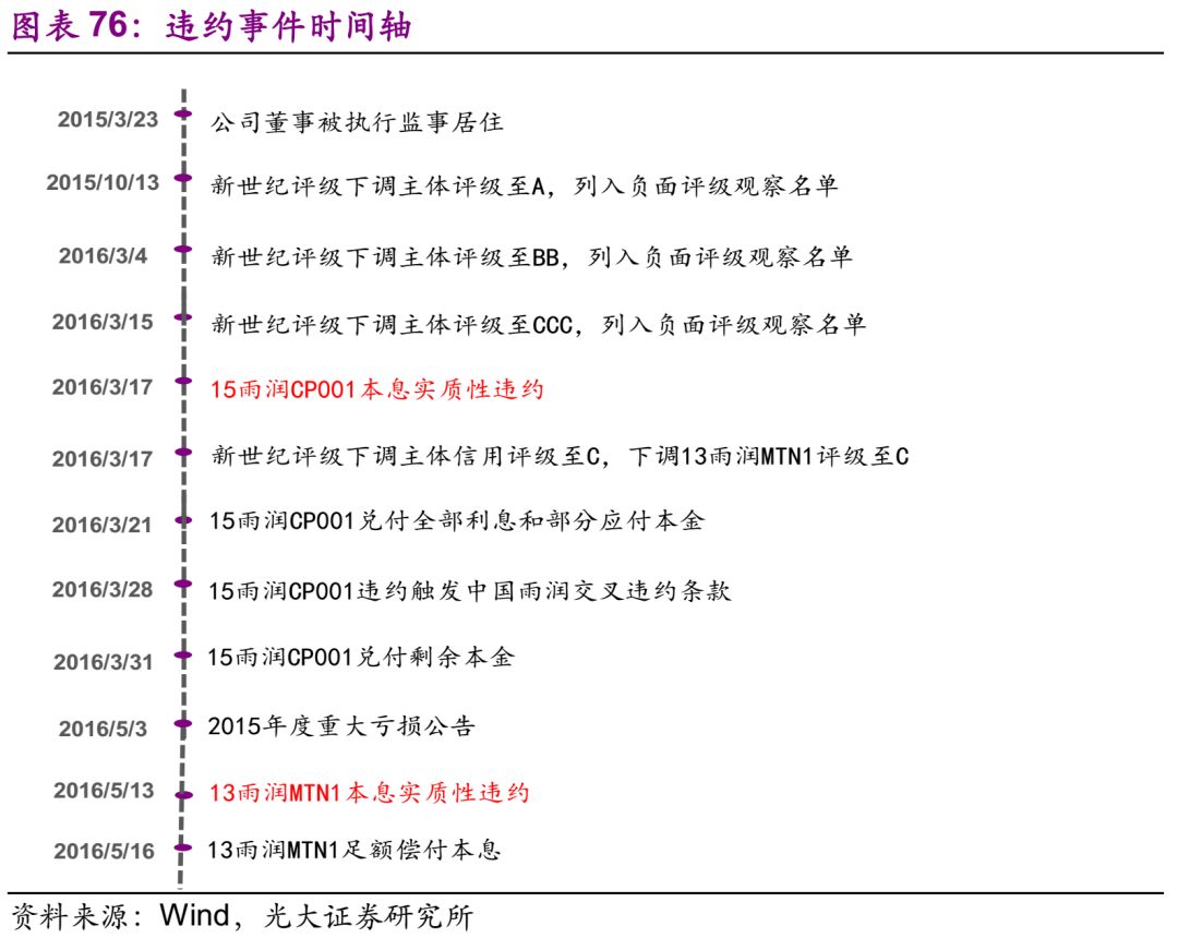 南京雨润 28.1、违约及最新债务情况 发行人南京雨润是外商独资企业,截至2018年7月13日,南京雨润共涉2起违约事件,均已足额偿付。其中,违约的“15雨润CP001”延期14天足额兑付本息,“13雨润MTN1”延期3天足额兑付本息。公司无存续债券。 28.2、违约事件历程 债券违约前的重大事件有: 1) 评级下调:主体评级从A下调至C。 2) 董事长被监视居住:实际控制人被执行指定居所监视居住。2015年3月23日,南京雨润实际控制人祝义财被检察机关执行指定居所监视居住措施,对公司生产经营、融资能力及财务状况带来不利影响;