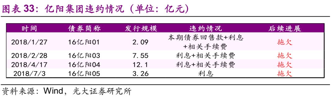 神雾环保 10.1、违约及最新债务情况 发行人神雾环保为民营企业,截至2018年7月13日,神雾环保共涉入1起私募债违约事件。公司应于2018年3月14日支付回售本金和利息,因公司流动资金较为紧张,未能如期兑付,构成实质性违约。 截至2018年7月13日,公司存续债券有1只,规模4.5亿元,已违约,将于2018年内到期。 10.2、违约事件历程 债券违约前的重大事项有:控股股东被司法冻结的股份比例较高,可能引发实际控制人变更风险。 后续偿债主要方法:继续加强公司自身经营,缩减资本支出,保证公司良性运转,继续推进引入战投,采取包括应收账款催收及外部融资等方式筹集资金,以缓解流动性压力。 亿阳集团 11.1、违约及最新债务情况 发行人亿阳集团为民营企业,截至2018年7月13日,亿阳集团共涉入4起一般企业债违约事件。公司应于2018年1月29日支付“16亿阳01”回售款、2017年1月27日至2018年1月26日期间的利息及相关手续费共计2.24亿元。由于公司正在进行重组工作,故无法按时偿还上述款项,构成实质性违约;2018年2月28日,拖欠“16亿阳03”利息及相关手续费,构成实质性违约;2018年4月17日,拖欠“16亿阳04”利息及相关手续费,构成实质性违约;2018年7月3日,拖欠“16亿阳05”利息,构成实质性违约。 截至2018年7月13日,公司存续债券有6只,规模合计40亿元,其中“16亿阳01”、“16亿阳03”“16亿阳04”“16亿阳05”已违约,“16亿阳06”和“16亿阳07”将于2019年内到期。 11.2、违约事件历程 债券违约前的重大事项有:评级下调;公司或子公司涉及重大诉讼等。后续偿债主要方法:拟实施重组。根据2017年12月27日公司披露的公告,亿阳集团与华融华侨已就重组方向与主要债权人进行了沟通,并与潜在的投资人进行了初步交流,并已经形成了初步的方案框架与思路。