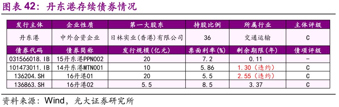 丹东港 14.1、违约及最新债务情况 截至2018年7月13日,丹东港共涉入5起违约事件。“14丹东港MTN001”应于2017年10月30日兑付利息以及回售部分本金,但公司仅划付了应付利息5860万元,无法按期兑付回售部分本金;“15丹东港PPN001”,应于1月13日付息及兑付本金,未能筹集足额偿付资金;“16丹港01”应于2018年1月29日付息,由于公司资金紧张,未能按时支付;“15丹东港MTN001”应于2018年3月12日将本息划至托管机构,但未按时划转;“13丹东港MTN001”应于2018年3月13日将本息划至托管机构,由于公司有息债务负担重,短期支付压力较大,未能按时支付。上述债券均构成实质性违约。 截至2018年7月13日,丹东港存续债券有4只,规模合计55.5亿元,其中“14丹东港MTN001”回售部分本金已违约、“16丹港01”未支付本息已违约,“16丹港02”、“15丹东港PPN002”等 2只债券均将于2018年内到期。 14.2、违约事件历程 债券违约前重大事项有:评级多次下调。后续偿债主要方法:继续加强公司自身经营,缩减资本支出,保证公司良性运转,继续推进引入包括国企和社会资本等战略投资者的工作等。