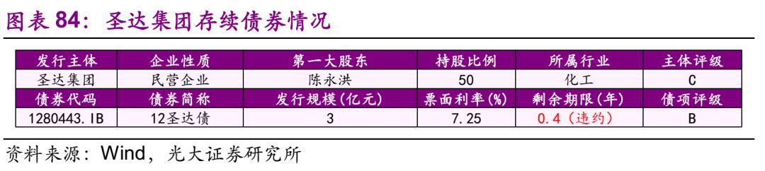 圣达集团 发行人圣达集团为民营企业,截至2018年7月13日,圣达集团共涉入1起一般企业债违约事件。公司应于2015年12月7日支付“12圣达债”当期利息及回售债券本金,因受外部经营环境及金融环境影响,公司生产经营业务受到冲击,同时资金流动性受到限制。虽然公司后来积极尝试引入新的投资人和合作者进行资产重组,但仍未筹措到资金,故构成实质性违约。 截至2018年7月13日,公司存续债券有1只,规模3亿元,已违约,将于2018年内到期。