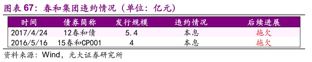 春和集团 24.1、违约及最新债务情况 发行人春和集团为民营企业,截至2018年7月13日,春和集团共涉入2起违约事件,现仍处于拖欠状态,公司无存续债券。 24.2、违约事件历程 违约前发生的重大事件有: 1) 连续3个月评级下调:2016/3/11 新世纪评级下调主体评级至BBB,2016/4/26 新世纪评级下调主体评级至BB,2016/5/9 新世纪评级下调主体评级至CCC。(评级下调原因: 1手持订单大幅下滑,2015前3季度大额亏损,2银行借款无法续借,已出现贷款逾期欠息,3前期投资大带来周转压力,4人事变动大,5债券兑付资金来源不确定,无偿债具体安排) 2) 子公司欠息、破产:2016/3/9下属子公司部分贷款逾期欠息,2016/5/6 下属子公司破产重整 3) 推迟披露财报:2016/4/14公司公告推迟披露2015年度审计财务报告至6月底 4) 提议延期付息:2016/4/29持有人会议,否决延期付息议案 后续偿债主要方法: 1) 资产处置:加快对留有净资产部分的公司资产以拍卖、变卖方式进行处置,变现后用以偿还债务。 2) 追讨应收款项:加快追讨公司对外应收款项和办理应收账款质押担保,用以偿还债务和为债券增信。 公司大量裁员,集团本部已停止经营,仅能维持最低限度运营的需要,所有资产被查封或抵押,偿债能力较弱,15春和CP001违约至今逾2年仍未能偿付本息,12春和债亦发生本息违约。截至2018年6月20日,集团共有银行负债总额约 69.73 亿元,包括集团本部及浙江造船有限公司、春和钾资源等关联企业的融资处于逾期状态。