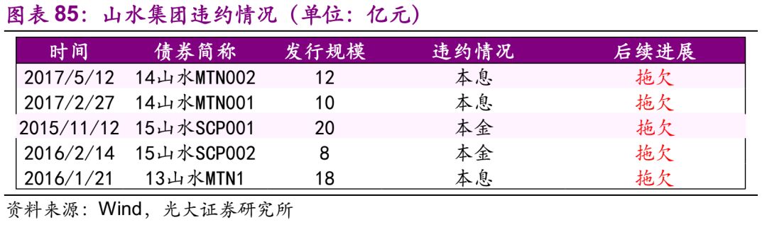 山水集团 34.1、违约及最新债务情况 发行人山水集团是外商独资企业,截至2018年7月13日,山水集团共涉入5起违约事件,违约本金规模达68亿元。公司无存续债券。 34.2、违约事件历程 债务违约违约前发生的重大事件有: 1) 连续评级下调:中诚信调低主体评级至C; 2) 母公司股权变动:母公司中国山水深陷控股权纷争。山水集团控制权及管理层存在极大的不确定性,导致公司的融资渠道受到限制; 3) 公司内部问题:2015/8/4公司小股东发出投诉信。 山水集团自第一只债券违约以来,尚未偿付违约债券。