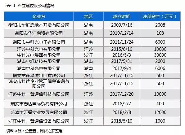 根据企查查查询,卢立建直接控股了13家公司(不含注销和吊销公司),从成立时间来看,主要集中在2017年下半年,并集中在湖南和浙江两个省份,从这些公司类型来看,主要是房地产和电子通讯类公司。从公司类型来看似乎与金融的关系不大,但其实主要是因为其做事比较隐蔽谨慎,基本均由卢家帮成员持股。另一位核心人物卢志建较为神秘,其此前入股的公司均已被注销,从股权上并看不出什么问题。