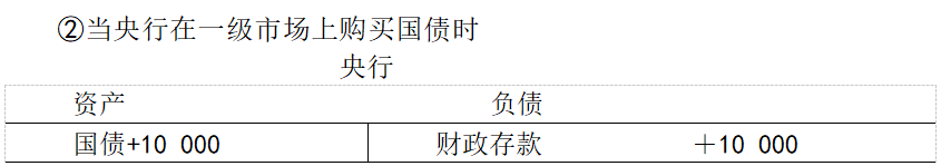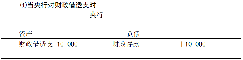 在各国《中央银行法》诞生前,当财政部发生赤字时,在政治上阻力最小的弥补方法是让央行为其增发货币,例如央行对财政部借透支、或在一级市场上购买国债,但这两种方法将等额投放基础货币,可用央行的T形帐户表示如下: