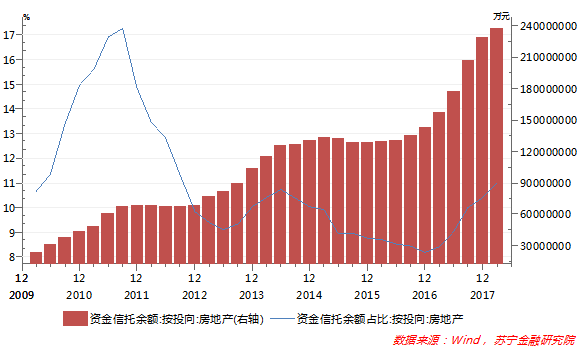 这只是房地产企业债务的冰山一角。在21.6万亿的资金信托余额中,投向房地产市场的规模高达2.37万亿元,占比10.99%,为2013年以来最高水平(参见下图),在其他委托贷款、券商资管计划、财富管理公司、小贷公司等其他融资渠道中,房地产企业融资比例也居重要地位。