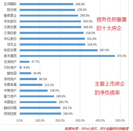 从图中可以看出,债务负担最重的房企中,已经曝出资金链困难的佳兆业、中弘股份名列其中。而泰禾集团净负债率高达473%,居上市房企的行业之首。在主要上市房企中,龙湖地产、碧桂园、保利地产的净负债率都在100%以下,其中万科地产的净负债率低至8.84%,为拉低整个行业净负债率做出了主要贡献,但对于大多数房企而言,净负债率高企的压力依然较大。