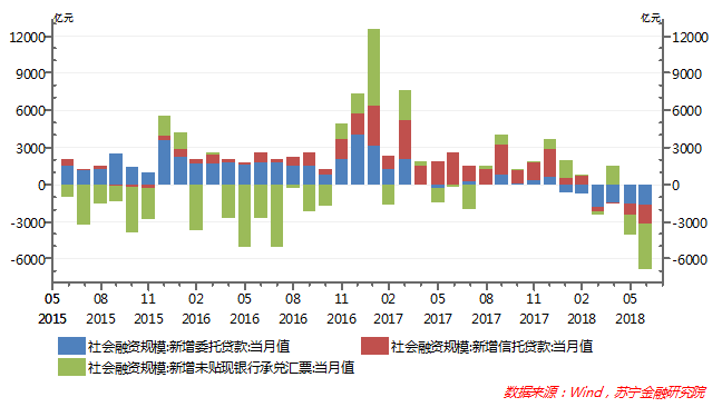 二是整体社会融资环境持续偏紧,到期债务存续困难。房地产企业获得资金的难易程度,主要取决于整体社会融资的环境松紧。今年上半年,M2、金融机构贷款余额、社会融资规模存量同比增速分别为8%、12.7%和9.8%,均创下或接近历史新低水平。值得注意的是,受资管新规影响,社会融资结构中委托贷款、信托贷款和短期票据融资更是连续两个月大幅同步收缩(参见下图)。