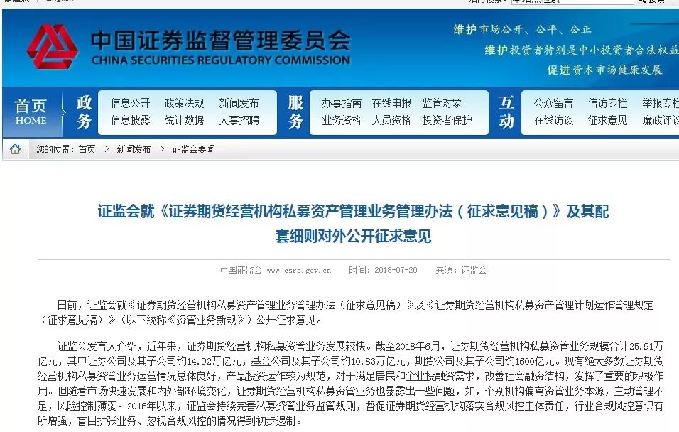 除了央行、银保监会,19日晚间证监会也发布了新政。证监会就《证券期货经营机构私募资产管理业务管理办法(征求意见稿)》及其配套细则对外公开征求意见。