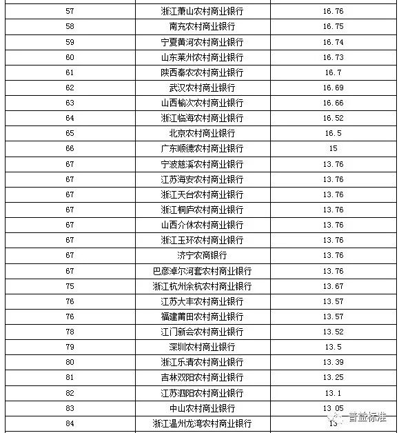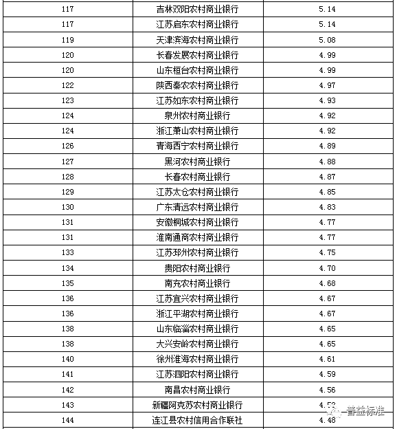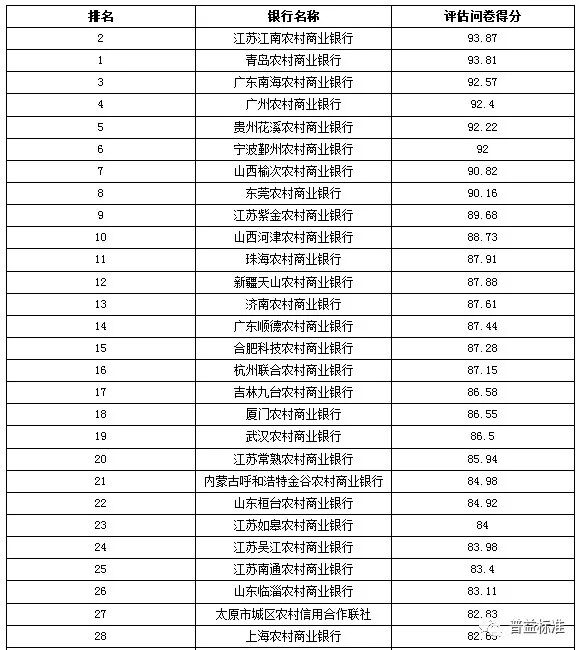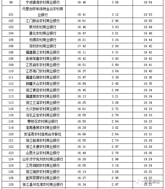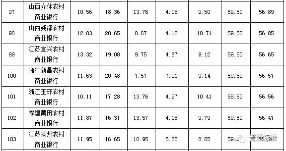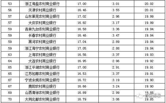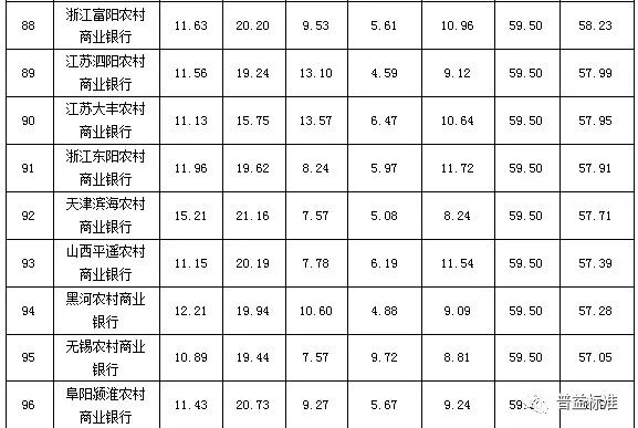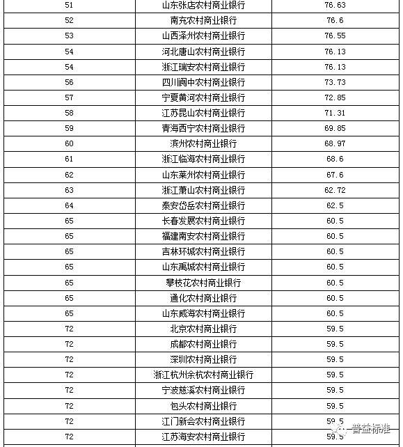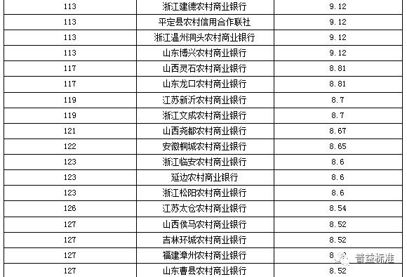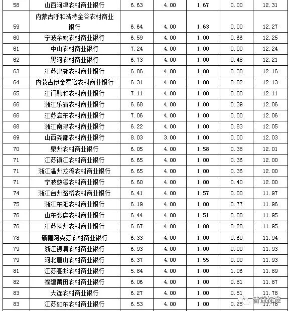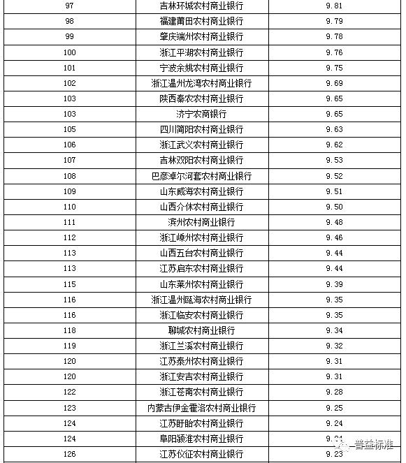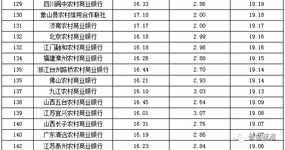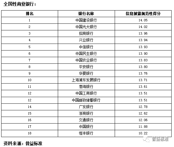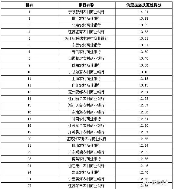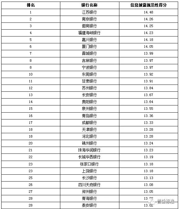 信息披露规范性:全国性银行排名前五的依次为中国建设银行、中国光大银行、招商银行、兴业银行和中信银行;城市商业银行排名前十的依次为江苏银行、南京银行、徽商银行、福建海峡银行、嘉兴银行、厦门银行、晋城银行、吉林银行、宁波银行(并列第8)和东莞银行;农村金融机构排名前十的依次为宁波鄞州农商银行、厦门农商银行、北京农商银行、江苏江南农商银行、浙江绍兴瑞丰农商银行、东莞农商银行(并列第5)、青岛农商银行、山西榆次农商银行、珠海农商银行、宁波慈溪农商银行。