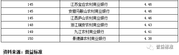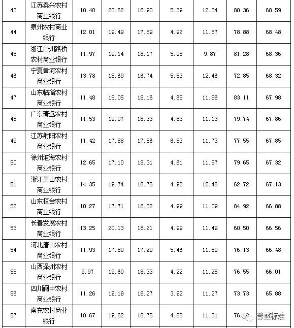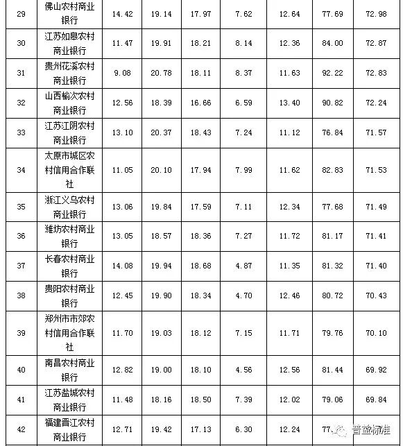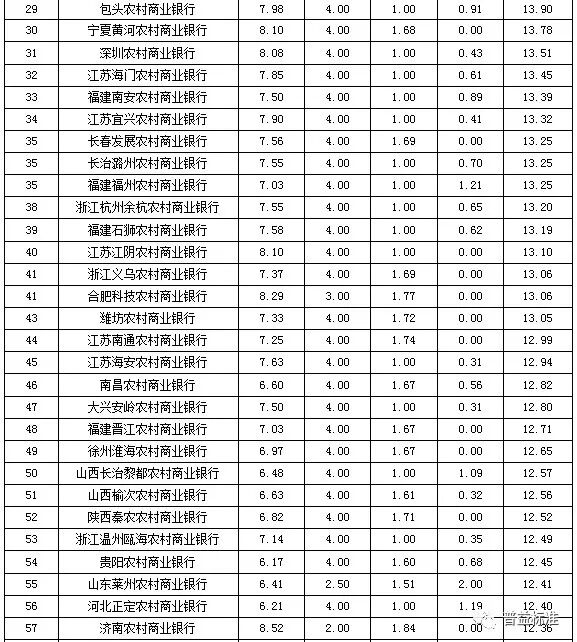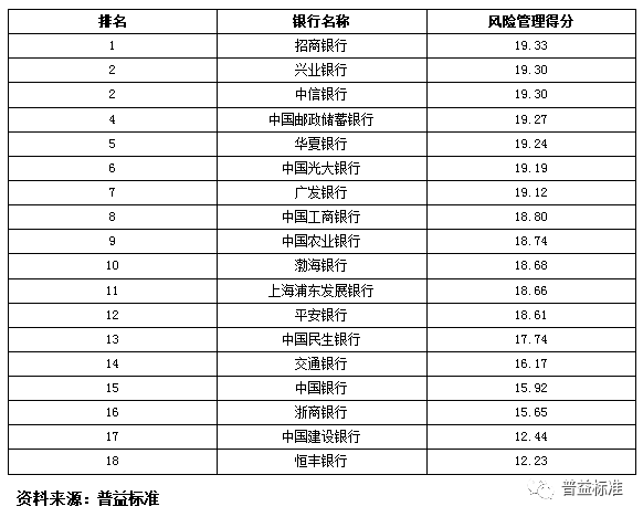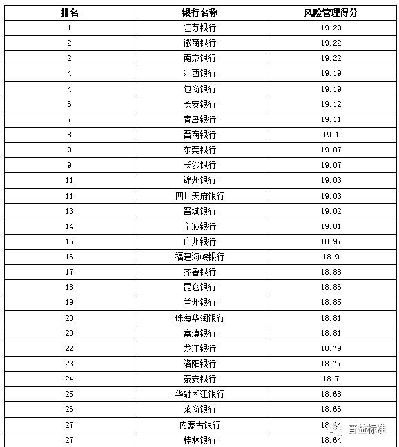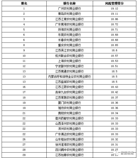 风险管理能力:全国性银行排名前五的依次为招商银行、兴业银行、中信银行(并列第2)、中国邮政储蓄银行和华夏银行;城市商业银行排名前十的依次为江苏银行、徽商银行、南京银行(并列第2)、江西银行、包商银行(并列第4)、长安银行、青岛银行、晋商银行、东莞银行和长沙银行(并列第9);农村金融机构排名前十的依次为广州农商银行、青岛农商银行、江苏江南农商银行、广东南海农商银行、珠海农商银行、东莞农商银行、长春农商银行(并列第6)、重庆农商银行、江苏吴江农商银行和杭州联合农商银行。