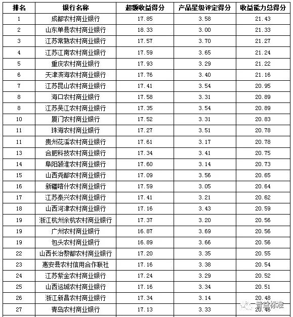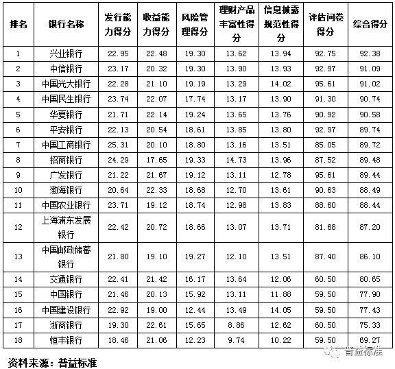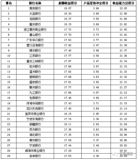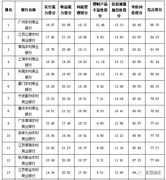来源:普益标准(ID:pystandard) 发布机构:普益标准 研究支持:普益寰宇研究院•西南财经大学信托与理财研究所 发布时间:2018年7月23日 整理:Bank资管(ID:yinhangziguan) 此次银行理财能力排名以2018年2季度为观察期。我们对观察期内各家银行的理财产品进行统计与评价,同时辅以评估问卷调查的形式对各家银行理财业务的产品研发、投资管理、产品销售、信息披露等方面进行考察与分析。本次排名对象为所有在本季度发行过产品的内资银行或本季度未发行产品但有产品存续或到期的内资银行,共计472家,较上期减少17家;其中包括全国性银行18家(国有银行6家,股份制商业银行12家),城市商业银行122家,农村金融机构332家。本季度收益能力排名囊括了所有预期收益型产品(包括封闭式、半开放式和全开放式产品)和净值型产品。 我们的数据来源于银行通过公开渠道披露的信息、与银行签订的数据交换协议及每季度银行反馈的动态问卷,其中本季度问卷返回数达168份。其中,动态问卷的反馈信息中涵盖了各家银行的发行总量及存续数据,再结合前两个渠道的数据,我们对2018年2季度银行理财产品存续规模总量进行了估计。472家商业银行(不包括外资银行)季末存续126649 款理财产品,较2018年1季度减少233款,环比下降0.18%,存续规模估计为29.09万亿元,较2018年1季度环比增长0.08%。 全国性银行排名前五的依次为兴业银行、中信银行、中国光大银行、中国民生银行和华夏银行; 城市商业银行排名前十的依次为江苏银行、南京银行、北京银行、上海银行、徽商银行、宁波银行、青岛银行、锦州银行、包商银行和东莞银行; 农村金融机构排名前十的依次为广州农商银行、江苏江南农商银行、青岛农商银行、上海农商银行、东莞农商银行、厦门农商银行、宁波鄞州农商银行、重庆农商银行、广东南海农商银行和吉林九台农商银行。 2018年2季度,全国性商业银行中,理财能力综合排名前五的银行依次是兴业银行、中信银行、中国光大银行、中国民生银行和华夏银行。 2018年2季度分类指标测度中,兴业银行位居综合理财能力排名第一位,在资管新规的冲击下,兴业银行各单项指标仍然位列前茅,凸显出该行稳健审慎的经营思路;在资管新规后,不少银行面临产品结构的调整,进而造成整体规模的回落,而中信银行凭借着合理的产品结构,保证了自身业务的稳步推进,带动理财规模的进一步上涨,最终位居综合理财能力第二位;本季度排名中中国光大银行名列第三位,该行在信息披露单项的出色表现,凸显其对于客户需求满足的重视程度。 全国性银行综合排名前十强中,全国性股份制银行与国有银行的比例为9:1,凸显资管新规并未影响股份制银行拓展资管业务的积极性。从各单项数值变化来看,较多全国性银行在转型压力下,面临着规模的小幅收缩,但同时全国性银行也增大了在风险管理能力、理财产品丰富性、信息披露规范性等方面的努力程度,尤其是信息披露的质量有明显提升。 2018年2季度,城市商业银行中,理财能力综合排名前十的银行依次是江苏银行、南京银行、北京银行、上海银行、徽商银行、宁波银行、青岛银行、锦州银行、包商银行和东莞银行。 2018年2季度,农村金融机构中,理财能力综合排名前十的银行依次是广州农商银行、江苏江南农商银行、青岛农商银行、上海农商银行、东莞农商银行、厦门农商银行、宁波鄞州农商银行、重庆农商银行、广东南海农商银行和吉林九台农商银行。 相对于全国性银行与城市商业银行,资管新规的正式落地,对于农村金融机构的整体冲击尤为显著。2018年2季度参与排名的农村机构数量减少为332家,较1季度减少19家,凸显资管转型压力迫使部分尚不具备开展资管业务能力的银行退出了资产管理行业。同时,据统计,第二季度部分农村金融机构虽有理财产品存续,但并未发行新的产品,业务重心也倾向于处理现有资产,对未来业务开展的方向持观望态度,静待银行理财监管细则的落地。如理财监管细则进一步趋严并结合农村金融机构本身更多限制,不排除第三季度中将有更多的农村金融机构选择暂时退出。虽然农村金融机构承受了更大的转型压力,但部分农村金融机构也展示了较强的综合能力,无论在产品的净值化转型方面,还是在标准化资产投研能力建设方面都积极投入,为未来市场份额的争夺奠定良好的基础。从2018年2季度的具体排名来看,广州农商银行、江苏江南农商银行及青岛农商银行仍然分列农村金融机构前三位,且综合理财能力不逊色于部分全国性银行及城市商业银行。 表1:银行理财能力综合排行榜(2018年2季度) 全国性商业银行 城市商业银行 农村金融机构 1 全国性银行排名前五的依次为中国工商银行、招商银行、中国民生银行、中国农业银行、中信银行; 城市商业银行排名前十的依次为北京银行、上海银行、江苏银行、南京银行、宁波银行、天津银行、哈尔滨银行、徽商银行、杭州银行、长沙银行; 农村金融机构排名前十的依次为重庆农商银行、上海农商银行、广州农商银行、江苏江南农商银行、北京农商银行、东莞农商银行、厦门农商银行、江苏常熟农商银行、青岛农商银行、武汉农商银行。 在全国性商业银行中,2018年2季度银行理财产品发行能力排名前五的银行依次是中国工商银行、招商银行、中国民生银行、中国农