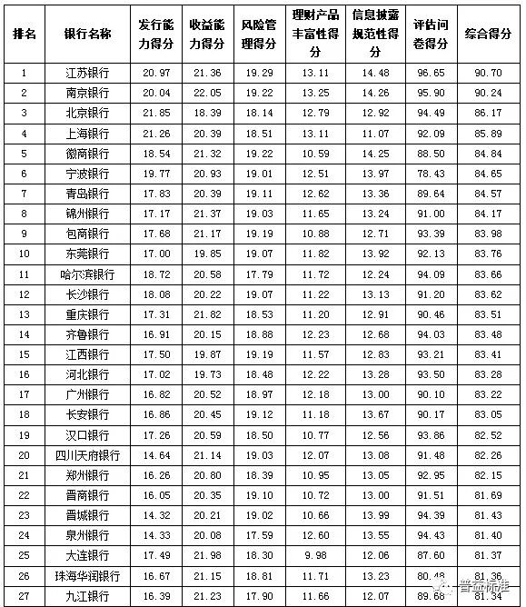 综合理财能力:全国性银行排名前五的依次为兴业银行、中信银行、中国光大银行、中国民生银行和华夏银行;城市商业银行排名前十的依次为江苏银行、南京银行、北京银行、上海银行、徽商银行、宁波银行、青岛银行、锦州银行、包商银行和东莞银行;农村金融机构排名前十的依次为广州农商银行、江苏江南农商银行、青岛农商银行、上海农商银行、东莞农商银行、厦门农商银行、宁波鄞州农商银行、重庆农商银行、广东南海农商银行和吉林九台农商银行。