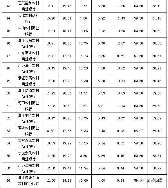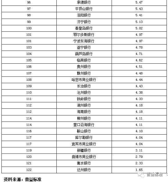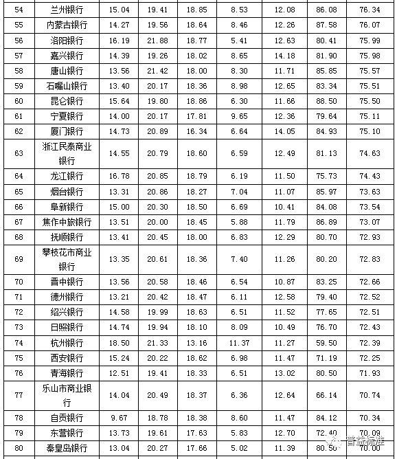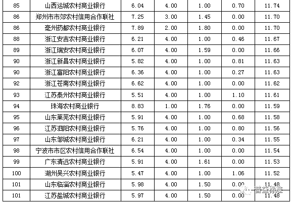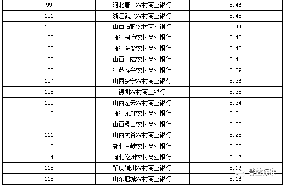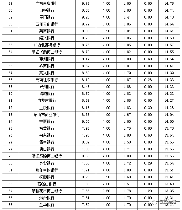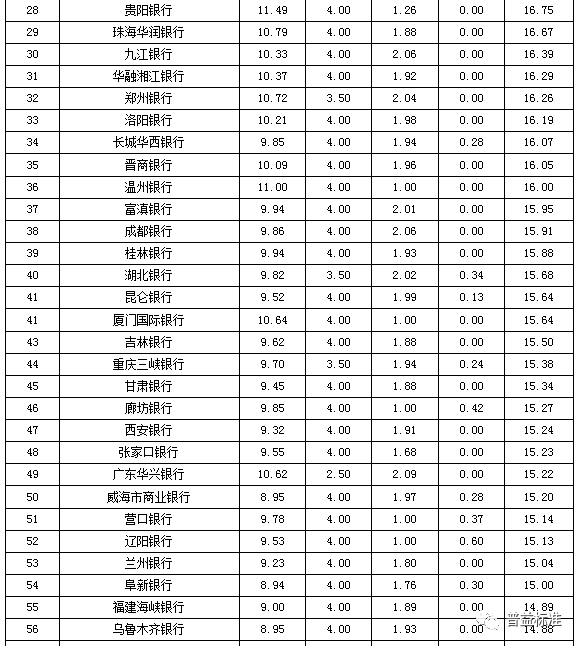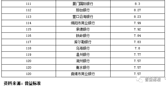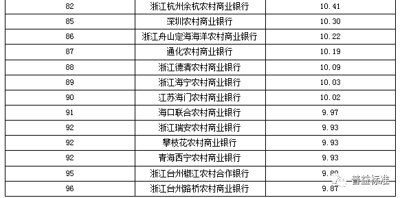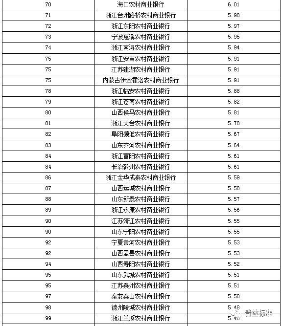 收益能力:全国性银行排名前五的依次为浙商银行、兴业银行、渤海银行、华夏银行、中国民生银行;城市商业银行排名前十的依次为南京银行、大连银行、洛阳银行、重庆银行、浙江稠州商业银行、唐山银行、广东华兴银行、营口沿海银行、锦州银行、江苏银行;农村金融机构排名前十的依次为成都农商银行、山东单县农商银行、江苏常熟农商银行、江苏江南农商银行、重庆农商银行、天津滨海农商银行、江苏昆山农商银行、海口农商银行、江苏吴江农商银行、厦门农商银行。