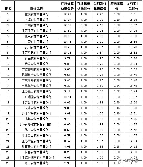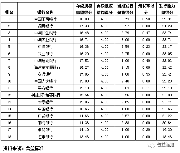 发行能力:全国性银行排名前五的依次为中国工商银行、招商银行、中国民生银行、中国农业银行、中信银行;城市商业银行排名前十的依次为北京银行、上海银行、江苏银行、南京银行、宁波银行、天津银行、哈尔滨银行、徽商银行、杭州银行、长沙银行;农村金融机构排名前十的依次为重庆农商银行、上海农商银行、广州农商银行、江苏江南农商银行、北京农商银行、东莞农商银行、厦门农商银行、江苏常熟农商银行、青岛农商银行、武汉农商银行。