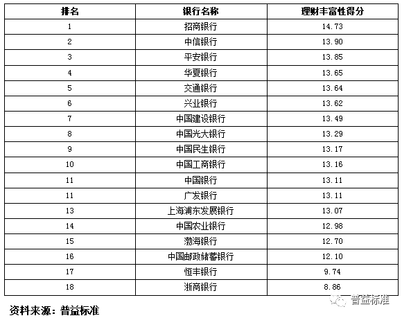 理财产品丰富性:全国性银行排名前五的依次为招商银行、中信银行、平安银行、华夏银行以及交通银行;城市商业银行排名前十的依次为南京银行、上海银行、江苏银行(并列第2)、北京银行、青岛银行、泉州银行、宁波银行、长城华西银行、齐鲁银行和河北银行;农村金融机构排名前十的依次为广州农商银行、广东顺德农商银行、上海农商银行、北京农商银行、东莞农商银行、江苏江南农商银行、无锡农商银行、青岛农商银行、广东南海农商银行和吉林九台农商银行。
