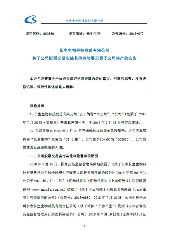 长生生物产品已全面停产 股票简称由“长生生物”变更为“ST长生” 24日晚间,长生生物公告称,目前除百白破联合疫苗、冻干人用狂犬病疫苗产品被责令停产外,公司决定对其他产品全面自主停产,生产车间在停产期间自查自纠,进行全面、彻底的整改。 公司股票将于7月25日开市起停牌一天,26日开市起复牌。26日开市起被实施其他风险警示,公司股票简称由“长生生物”变更为“ST长生”。