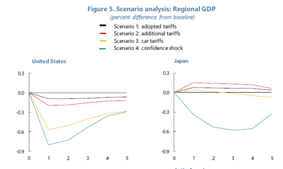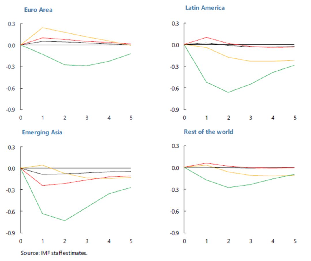 人们越来越担心贸易局势的紧张可能会影响全球经济。虽然全球经济增长普遍强劲,但贸易局势紧张:新关税和反制性关税此起彼伏,发达市场和新兴市场经济都有明显的下行风险。贸易局势带来不确定性上升,股市和商业信心也迅速反映了由此带来的不利影响。例如,在宣布可能征收关于进口汽车和从中国进口商品的关税后,欧洲汽车制造商和风险敞口大的美国公司(这些公司与中国或国际有着密切的贸易关系)股价相对于大盘指数大幅下跌(图1和图2)。同样,近期数据显示新出口订单放缓,商业信心下降,尤其是包括德国在内的汽车出口占比较高的欧洲经济体(图3)。 IMF假设了贸易局势的四种情景,通过IMF构建的动态宏观经济模型(该模型整合了货币和财政变量,涵盖了美国、日本、欧元区、新兴亚洲(包括中国)、拉丁美洲和世界其他地区这六个国家和地区),模拟分析了不同场景下对全球GDP和各个国家和地区GDP的影响。需要强调的是,这场景模拟并不是预测,并且模拟没有考虑到全球贸易或全球供应链的行业结构,这些因素可能会增加贸易行动升级的成本,并可能改变在各国的成本的分配。 1.美国对其进口钢铁(25%)和铝(10%)征收更高的关税; 2.美国对从中国进口的价值500亿美元商品征收25%的关税; 3.假设所有受影响地区对美国施加同等规模的报复性关税。在以下情景中,假设关税增加是永久性的。 在情景1的基础上,美国对从中国进口的价值2000亿美元商品额外征收10%的关税,中国进行同等规模的报复。 在情景2的基础上,(i)美国进口汽车的关税增加了25%; (ii)所有受影响地区对同等金额的美国出口汽车进行报复。 在情景3的基础上,引入暂时性全球信心冲击,以此刻画当贸易局势进一步紧张时,供需两端的企业面临的潜在影响。在模型中,通过风险溢价的上升程度来衡量冲击对制造业企业投资的负面影响。冲击的程度存在不确定性,在模型中我们假设信心的冲击将使发达经济体的风险溢价上升30个基点(0.3%)(在这里风险溢价的估计参考了外部数据,即2013年削减恐慌(Taper Tantrum)时市场溢价上升的规模,并假设贸易局势的紧张对风险溢价的影响是削减恐慌时的一半),结果显示,当其他变量不变的情况下,风险溢价上升0.3%,将导致投资下降1%。模型中假设信心的冲击将使新兴市场经济体的风险溢价上升双倍(0.6%)。信心的冲击将在两年内达到顶点,并在中期消失。 IMF模拟的场景显示,当贸易紧张局势削弱信心时,短期影响尤为负面。在最悲观的模拟(情景4)中,全球GDP规模(水平)相对于基准而言,在第一年将降低约0.4%,在第二年约为0.5% ——影响可能会更低或更高,具体取决于假设的信心冲击程度(图4)。关税本身对全球GDP带来的冲击较小,相对于基准而言,对全球GDP最大的冲击使GDP降低0.1%(情景3)。 总体而言,关税对美国经济的负面影响要大于其他国家(图5)。主要原因是由于“辐射式”的相互强迫性关税的征收:由于美国对其他国家的商品征收关税,它相应地遭受相同规模的报复。因此,美国出口的较大份额商品最终会受到影响。相比之下,其他地区在没有征收额外关税的情况下继续相互交易,从而发生贸易转移可以对与美国的贸易流量进行一些调整。在引入对从中国进口商品的额外关税以及中国采取报复后(情景2),美国GDP规模相对于第一年的基准下降约0.2%,然后在第五年负面影响减弱到0.1%。如果贸易争端扩大到包括美国汽车进口(情景3),美国GDP第一年的冲击为0.6%,第五年负面冲击削弱到0.3%。 对其他国家和地区的影响反映了关税和贸易转移的直接影响。美国和中国之间的高关税(情景2)对亚洲新兴国家GDP产生了负面的影响,第一年的损失约为0.2%。其他地区作为贸易替代品的出口国或地区将会收益(需要补充说明的是,情景模拟不是预测,只是说明一般均衡力量的演变。一个更精细的模型需要考虑不同行业阶层间产生的结果,例如,贸易替代弹性的差异 ——并考虑到扰乱全球供应链和调整成本可能会在所有地区造成损失。) 在汽车关税模拟(情景3)中,日本遭受的打击最为严重,拉丁美洲和其他地区次之。日本受到的冲击最大,主要是由于日本贸易结构所致(占向美国出口价值总量的29%是汽车),GDP损失高达0.2%左右。这抵消了情景2中贸易转移带来的暂时性收益,因此短期内两种关税措施的综合效应大致为零。拉丁美洲(汽车占对美国出口总量的13%)和世界其他地区(11%)受到的负面影响程度次于日本。与情景2相比,情景3下新兴亚洲会带来暂时的收益,这是由于汽车出口占其对美国出口价值总额的很小份额,而且它们现在受益于贸易转移。模拟表明,欧元区是一个至少可以暂时受益于关税增加的地区。虽然它向美国出口了大约300亿美元的汽车,但这些汽车占出口总量的不到1%,因此关税对汽车的直接影响远远超过了贸易转移。然而,正如所讨论的,这些结果并未考虑供应方面的扭曲和调整中的摩擦。 如果不断升级的贸易紧张局势导致负面的信心冲击,全球都是输家(情景4)。尽管确切的冲击水平很难确定,但其影响广泛,模拟情景中不断升级的贸易摩擦的负面影响,可能会使实际影响被低估。独立模拟信心冲击,有助于刻画信心冲击,使避险情绪升温(风险溢价上升),从而对投资、消费和产出产生负面影响。其中一个因素是货币政策的反应,在场景4中,美国和其他地区的货币政策将转为宽松,但有效利率