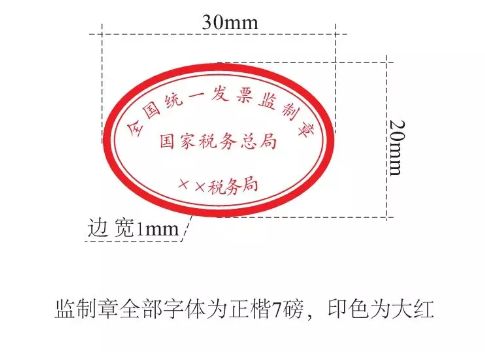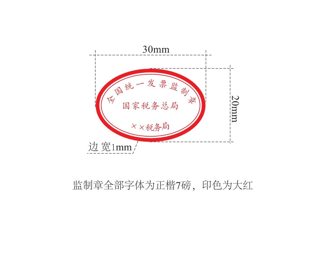 新启用的发票监制章形状为椭圆型,长轴为3厘米,短轴为2厘米,边宽为0.1厘米,内环加刻一细线,上环刻制“全国统一发票监制章”字样,中间刻制“国家税务总局”字样,下环刻制“××省(区、市)税务局”字样,下环字样例如:“江苏省税务局”、“上海市税务局”、“内蒙古自治区税务局”、“新疆维吾尔自治区税务局”。字体为楷体7磅,印色为大红色。