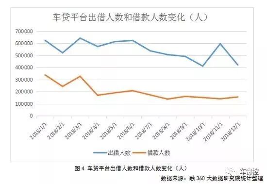 2018年底车贷行业活跃出借人、借款人数量分别为42.2万人、15.7万人。统计数据显示车贷行业借款人自今年3月出现大幅减少后,随后每月均少于20万借款人,可以看出年初针对贷后催收的监管政策让车贷平台对借款人的审核更为严格。