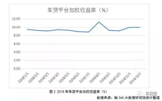 数据显示,2018年前7个月车贷平台加权收益率均低于10%,而8月份车贷平台加权收益率为11.22%,高于网贷行业平均加权收益率10.36%。但之后行业收益率开始下跌随后稳定在10%左右。8月收益率突增的原因在于7月爆雷潮之后,平台为吸引出借人并缓解短期资金流压力,加息力度提升,因此8月加权收益率较过去上涨明显。随后随着各平台开始出现资产荒,不需要吸引大量网贷出借人资金,因此开始降息。