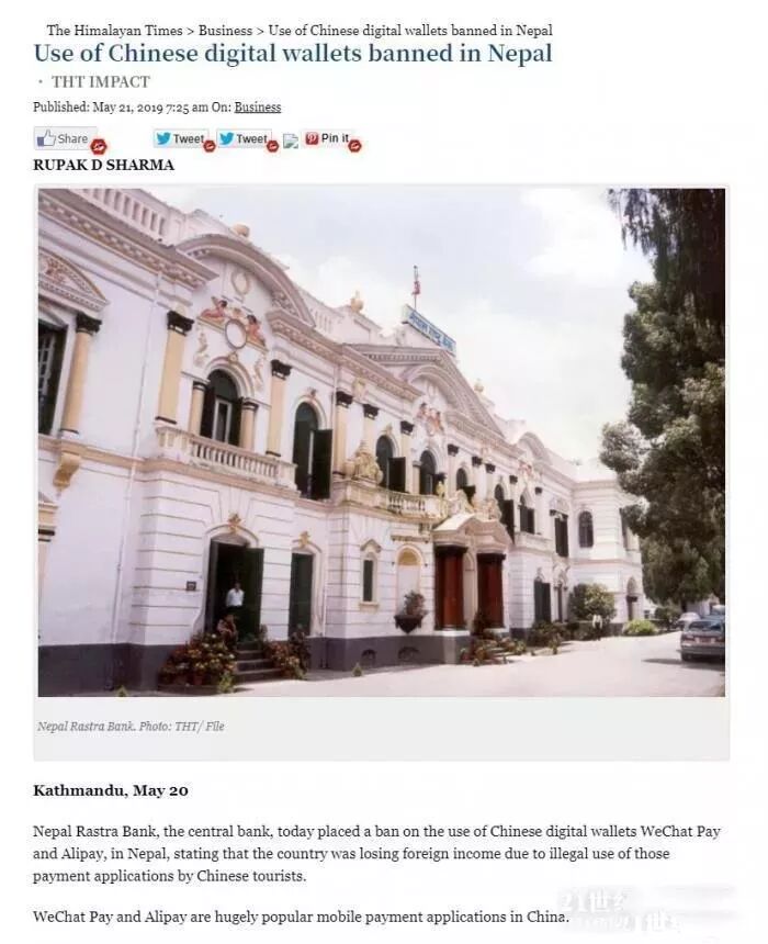 尼泊尔中央银行禁止境内使用支付宝和微信支付据外媒报道,今日尼泊尔中央银行(Nepal Rastra Bank,NRB)正式宣布禁止在尼泊尔使用微信支付和支付宝进