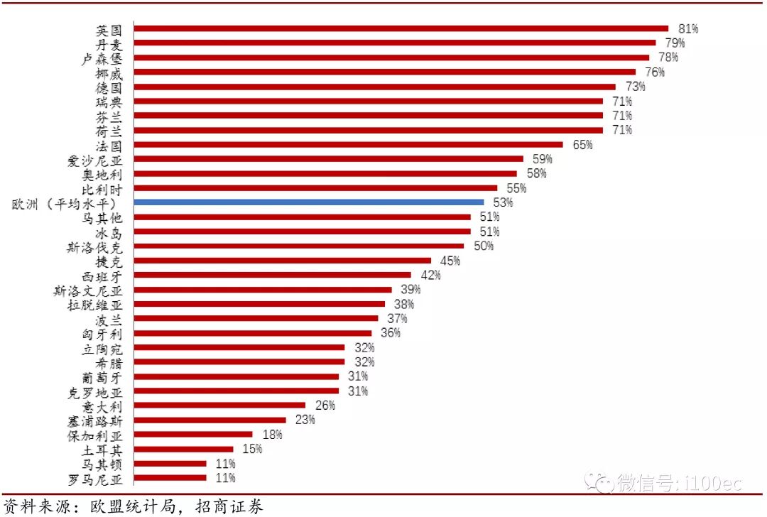 根据欧盟统计局最新数据统计:87%的英国购物者过去12个月内网购过,丹麦以84%紧随其后。而在地中海沿岸地区和东欧地区,电商发展相对落后,未来可能成为电商的新蓝海。欧洲最大的电商市场虽然集中于英法德,但这三个国家网购比例并不是最高的,仍有可扩展的空间。