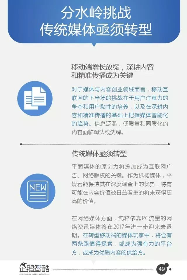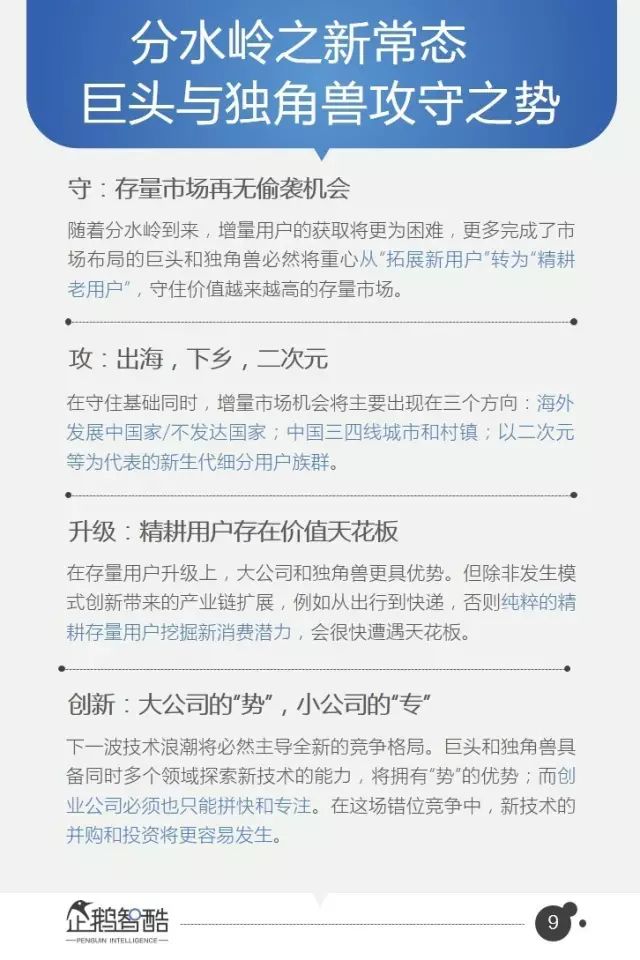 作者:企鹅智库来源:企鹅智库(ID:BizNext)“分水岭”将成为未来5年中国互联网的关键词,从浅水区向深水区过渡,引发竞争格局的强弱式转化。分