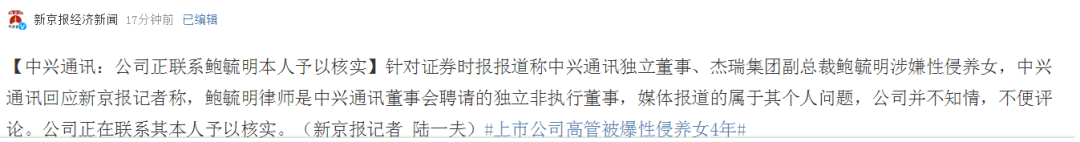 据新京报,中兴通讯回应称,鲍毓明律师是中兴通讯董事会聘请的独立非执行董事,媒体报道的属于其个人问题,公司并不知情,不便评论。公司正在联系其本人予以核实。