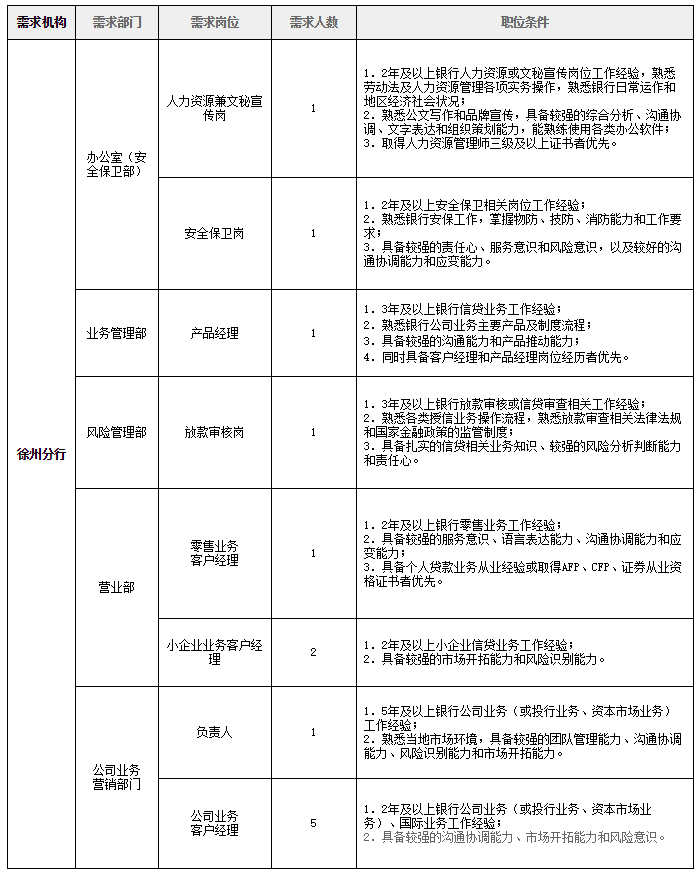 浙商银行股份有限公司(简称“浙商银行”)是经中国银监会批准的12家全国性股份制商业银行之一,2004年8月18日成立,总行设在浙江杭州。2016年3月30日在香港联交所上市(股票代码:2016.HK);2019年11月26日在上海证券交易所上市(股票代码:601916),成为全国第13家“A+H”上市银行。经过多年发展,浙商银行已成为一家基础扎实、效益优良、成长迅速、风控完善的优质商业银行,在英国《银行家》杂志“2019年全球银行1000强”榜单中按一级资本位列第107位、按总资产位列第98位。中诚信国际给予浙商银行金融机构评级中最高等级AAA主体信用评级。浙商银行南京分行是浙商银行在江苏省内设立的一级分行,于2008年12月18日正式开业。自开业以来,南京分行紧紧围绕总行愿景与经营发展战略,主动适应经济金融形势变化,全力投身地方经济建设,不断拓展金融服务半径,持续打造特色竞争力,现已在南京市鼓楼区、秦淮区、江宁区、浦口区、建邺区、栖霞区以及无锡、南通、泰州、常州、盐城、扬州、徐州、淮安8个地级市设立了22家分支机构,存款、贷款、利润增速以及资产质量均保持较好发展水平,曾获得2016年度浙商银行“战略推进特别奖”,2017、2019年度浙商银行“突出贡献奖”,人民银行南京分行(国家外汇管理局江苏省分局)颁发的执行人民银行政策A类行、执行外汇管理政策A类行,江苏银监局颁发的监管评价2B级、江苏省银行业金融机构小微企业金融服务工作先进单位等一系列权威认可与荣誉。浙商银行徐州分行是南京分行在江苏设立的第7家二级分行,于2018年9月19日开业。因业务发展需要,现面向社会诚聘金融人才,我们将为每位加盟的员工构建良好的职业生涯发展规划,并提供业内具有竞争力的薪酬福利待遇,热忱欢迎有志之士和专业人才加入。(二)身体健康,品貌端正,具有良好的心理素质和抗压能力;(五)具有2年及以上银行工作经历,且具备岗位所要求的专业知识、从业经历和业务能力;(六)具有较强的责任意识、团队合作精神及良好的沟通、协同能力;(七)具有良好的个人品质与职业道德,无不良从业记录;登录浙商银行招聘门户网站http://zp.czbank.com.cn,进行简历完善并对照岗位投递简历;(一)经初审合格者将通知面试,面试时请携带身份证原件以及相关证书资料(学历证书、学位证书、已有任命文件、职称技能证书、相关资格证书等)原件及复印件。应聘信息将予以严格保密,所有复印资料恕不退还。(三)如有需要请联系我们,联系人:吴先生,电话:0516-83339016。https://zp.czbank.com.cn/zpweb/planController/gotoIndex.mvc?pageType=2