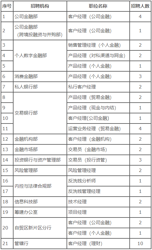 根据业务发展需要,中国银行股份有限公司上海市分行(以下简称“中国银行上海市分行”或“我行”)部分职位面向社会公开招聘,现就有关招聘事宜公告如下:1、遵纪守法,诚实守信,具有良好的个人品质和职业操守,无不良从业记录,愿意履行中国银行员工义务和岗位职责;2、全日制大学本科及以上学历,留学归国人员应取得教育部留学服务中心的学历学位认证;3、具有与岗位要求相适应的教育背景、工作经验和专业能力;4、具有较强的学习能力和较好的团队合作精神,具有良好的风险意识,能熟练使用OFFICE及各类办公系统;5、身体健康,并具备与职位、工作要求相适应的身体条件;本次招聘采用网上报名方式,有意者请登录以下网址进行申报:http://bocsh.51ideal.com。经审核符合条件者,我行将通过电话、电子邮件等方式与应聘者联系。应聘者个人信息仅用于此次招聘,我行对所有应聘者信息予以保密,所有应聘者资料恕不退还。应聘者对个人填报信息的真实性、完整性负责,如与事实不符,我行有权取消录用资格。一经录用,将按照国家有关规定实行劳动合同制管理。报名截止时间:北京时间2020年6月30日24时。中国银行上海市分行2020年社会招聘职位信息及任职资格表.pdfhttps://pic.bankofchina.com/bocappd/appform/202006/P020200619704102180001.pdf