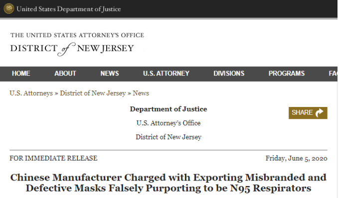 美国新泽西地区联邦检察官卡佩尼托(Craig Carpenito)和纽约东区联邦检察官多诺霍(Richard P. Donoghue)5日宣布,正式起诉中国金年包装印刷有限公司(King Year Packaging and Printing Co. Ltd.,简称金年包装),在美国疫情期间生产并向美国出口将近50万个伪劣N95口罩;并谎称这些口罩符合N95口罩的标准,从而触犯美国联邦食品药物和化妆品法案(Federal Food, Drug and Cosmetic Act)。