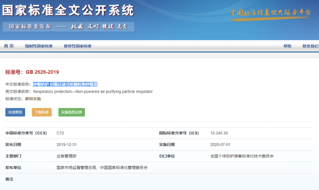 2019年底,国家市场监督管理总局和中国国家标准化管理委员会发布了新的呼吸防护标准GB2626-2019呼吸防护 自吸过滤式防颗粒物呼吸器,2020年7月1日实施。