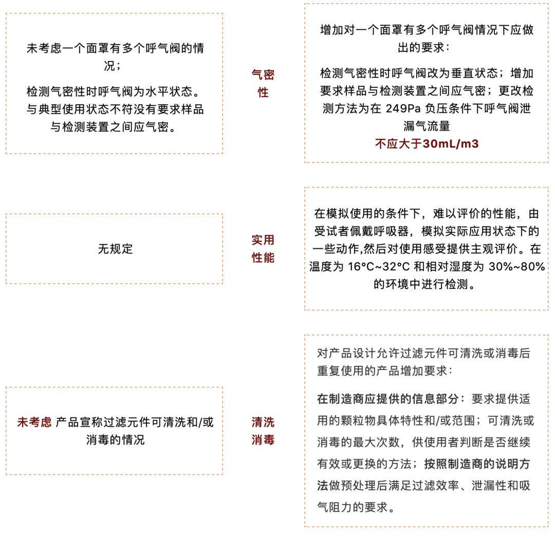 相对于2006版,在遵循科学性、规范性、协调性、时效性等基本原则的基础上,根据科学进步和产品发展的趋势,在不降低防护能力的前提下调整呼吸阻力指标,完善检测方法,优化半口罩的下方视野,提高产品的舒适性。